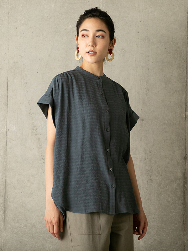 バンドカラーのシャーリングシャツ。ひらりと揺れる背中のヨークデザインが大人可愛い一枚。インでもアウトでも合わせやすい丈でリラックス感のある着こなしが叶います。これからの季節に丁度いい清涼感のある薄手のシャドーボーダー生地を使用しています。