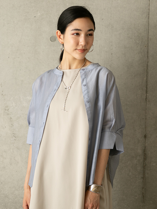 トレンドのシアー素材を使用したバンドカラーシャツ。あえて着丈を短めにすることで、ノースリーブのトップスやワンピーススタイルの羽織りとしてバランス良く着こなしていただけます。薄く軽いので日焼け防止や冷房対策にも一枚持っていて損はないアイテムです。