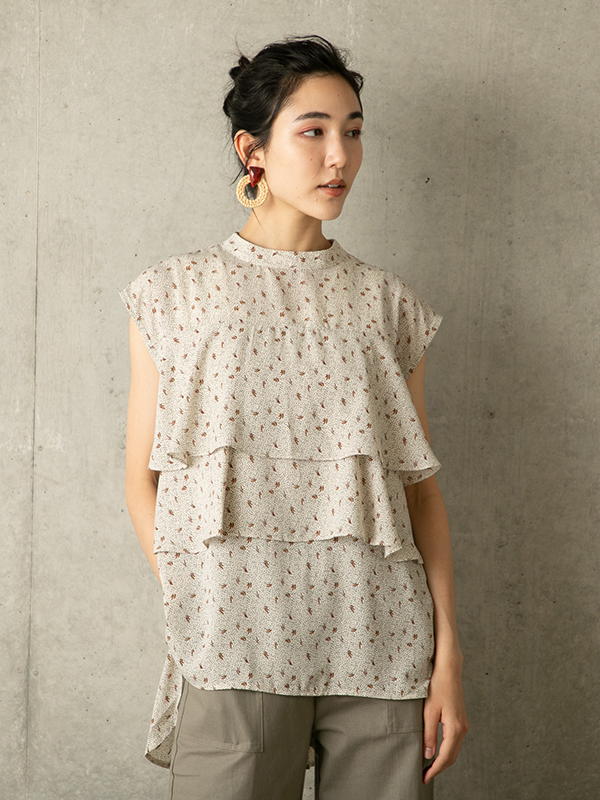胸下のフリルデザインと背面のプリーツ切替えで着映えすること間違いなしのデザイントップス。デニムやテーパードパンツと合わせて甘辛MIXも◎同素材のスカート(No.56039)と合わせてワンピース風の着こなしも華やかでおすすめです。