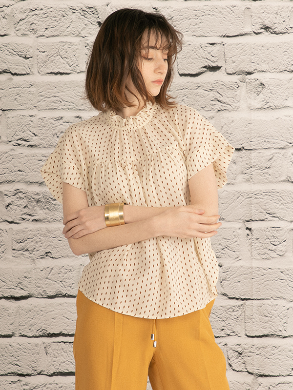 フレンチスリーブのスタンドネックフリルブラウス。変形ドット柄のシフォン素材を使用しています。柄物が苦手な方でも取り入れやすいドット柄で今の時期はカーディガンやジャケットにインナーに、季節が進んだら一枚でと長い期間お使いいただけるアイテムです。