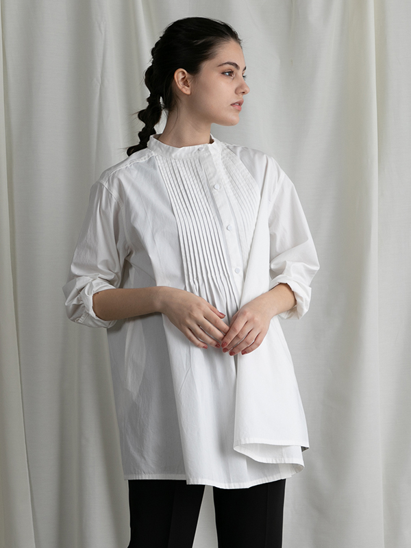 胸元に施した細かなピンタックが上半身を華奢に見せ、裾にかけて自然な広がりをもたせてくれます。甘くなり過ぎないようネックはスタンドカラーにして、袖もスッキリとしたデザインに。腰回りをカバーしてくれ、ボトムを合わせやすいほど良い丈感に仕上げました。