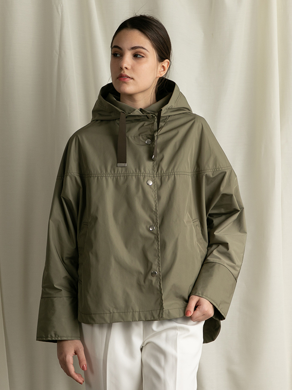 ハリのある高密度ポリエステル素材を使用したフードジャケット。ドルマンスリーブデザインなので、インナーにボリュームのあるトップスを合わせても腕周りがもたつくことがありません。立ち上がりの良い大きめのフードで小顔効果も◎両脇に入った深めのスリットがサイドからのラインをすっきりと見せてくれます。丸みのあるコクーンシルエットが大人可愛い一着です。