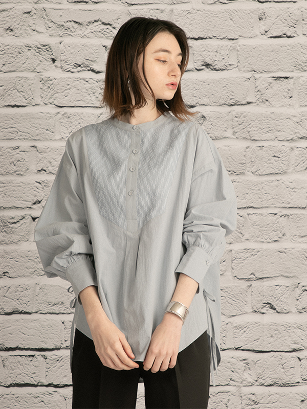 前身頃のヨークと背中部分をジャガードシフォン生地で切り替えた、ハリのあるコットン素材を使用したバンドカラーのシャツ。脇部分は深くスリットを入れリボンを付けてアクセントに。背中のタックで身体を泳がせ丸みのあるシルエットに。こだわりが沢山詰まったおすすめの一枚です。