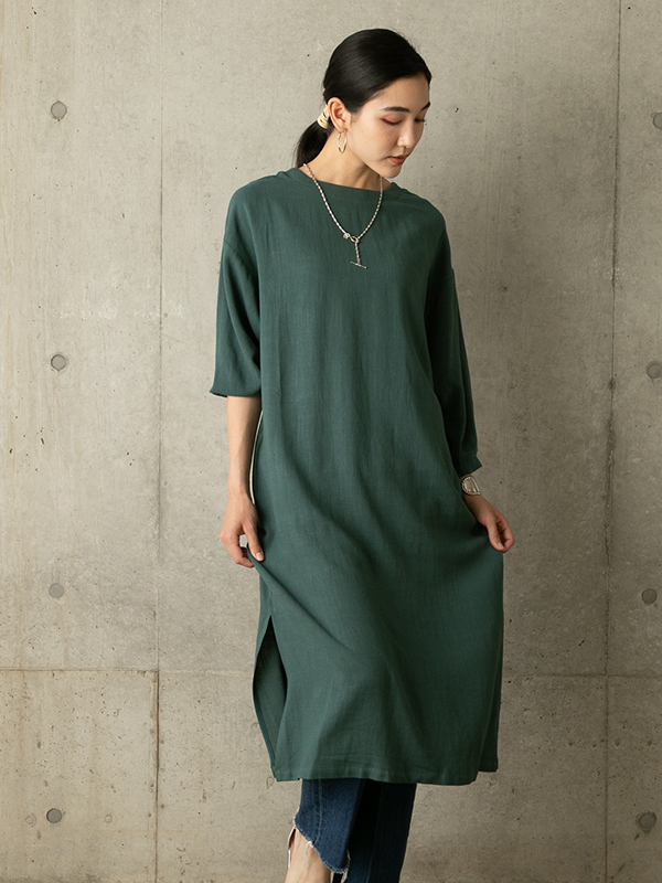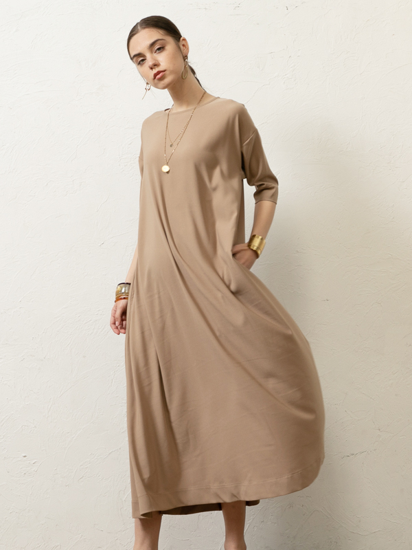 落ち感のある素材を使いドレープ感が上品な、シンプル5分袖のマキシワンピース。