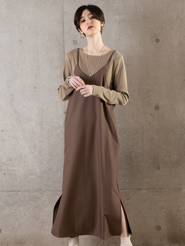程良いハリと上品な微光沢生地で仕立てたキャミソールワンピース。