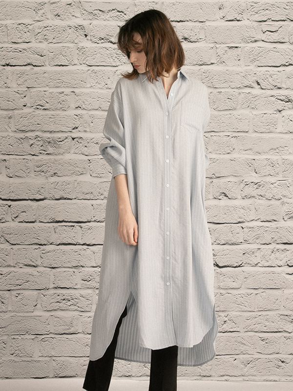 ストライプ状の織り柄がある生地を使用したロングシャツワンピース。背中にはたっぷりとギャザーを施したリラックスムードなシルエット。スウェットやニットベストを重ねたり、前開きにして羽織りとして使ったりと多様な使い方が可能です。サイドにポケット付きです。