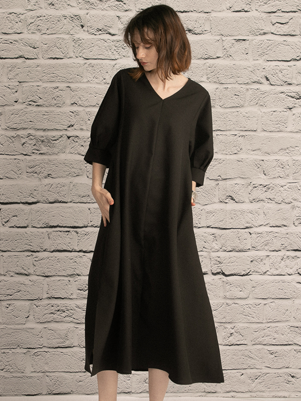 両Vネックが首元をきれいに見せてくれるロングワンピース。両脇にスリットが入っているのでロング丈でも軽やかな印象に。ボリュームのあるデザインスリーブは肘が隠れる丈感が大人な雰囲気。シワになりにくく、締め付けのないコンフォートなデザインで夏場はさっと着ることができてサマになる頼れる一着です。