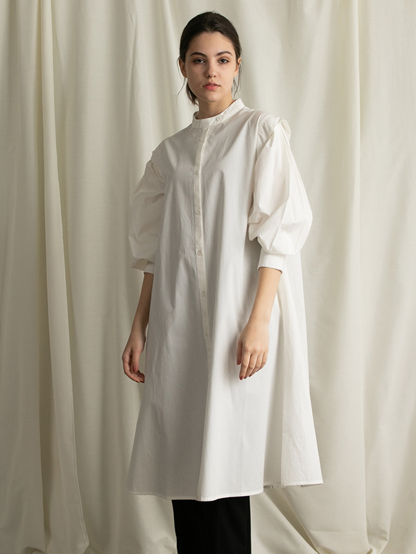 引き続き人気のバンドカラーワンピース。今シーズンは袖にボリュームを持たせ、ショルダー部分を切り替えて重ね着しているようなデザインにしました。裾にかけて広がったテントラインシルエットは身体のラインをひろわず、スッキリと着用できます。ワンピースとしてはもちろん、パンツやスカートなどとのレイヤードもおススメです。