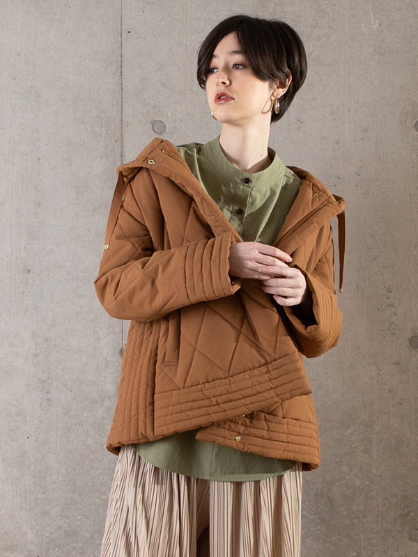 Aラインに広がるボリュームシルエットが女性らしいキルティングフードジャケット。