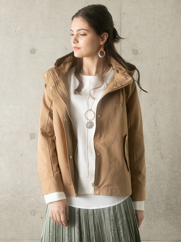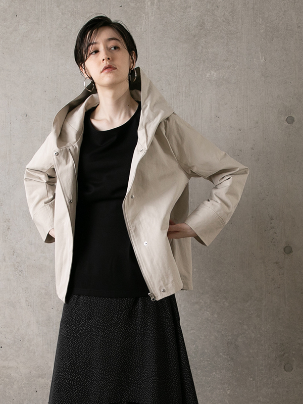ハリのある高密度ポリエステル素材を使用したフードジャケット。ドルマンスリーブデザインなので、インナーにボリュームのあるトップスを合わせても腕周りがもたつくことがありません。立ち上がりの良い大きめのフードで小顔効果も◎両脇に入った深めのスリットがサイドからのラインをすっきりと見せてくれます。丸みのあるコクーンシルエットが大人可愛い一着です。