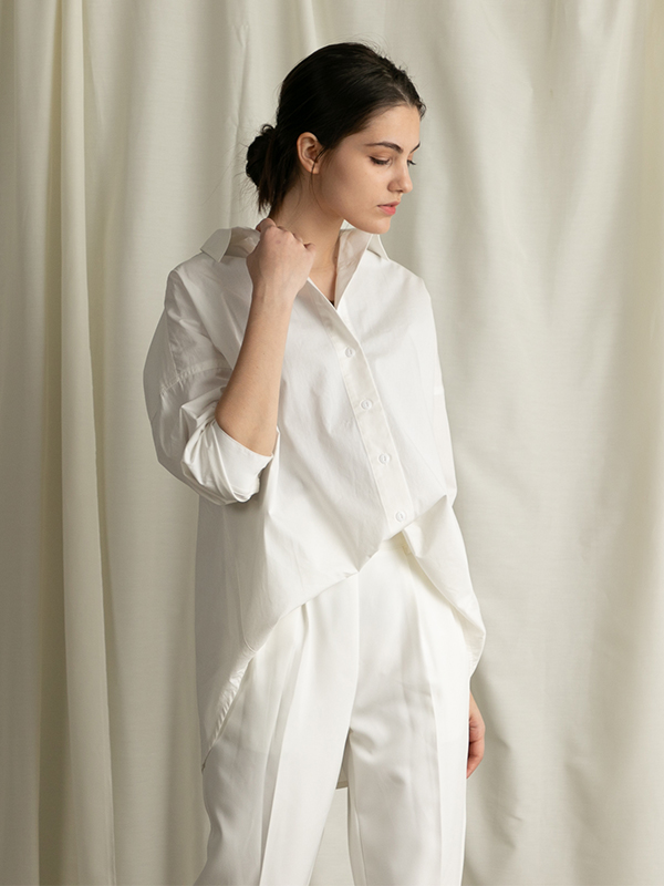 さらりとした肌触りの綿素材を使用したリラックスサイズのシャツ。長めの丈ながら、前後差のあるヘムラインでアレンジしやすく、ボトムを選ばず着用いただけます。シンプルなデザインで様々なシーンに取り入れていただけるアイテムです。